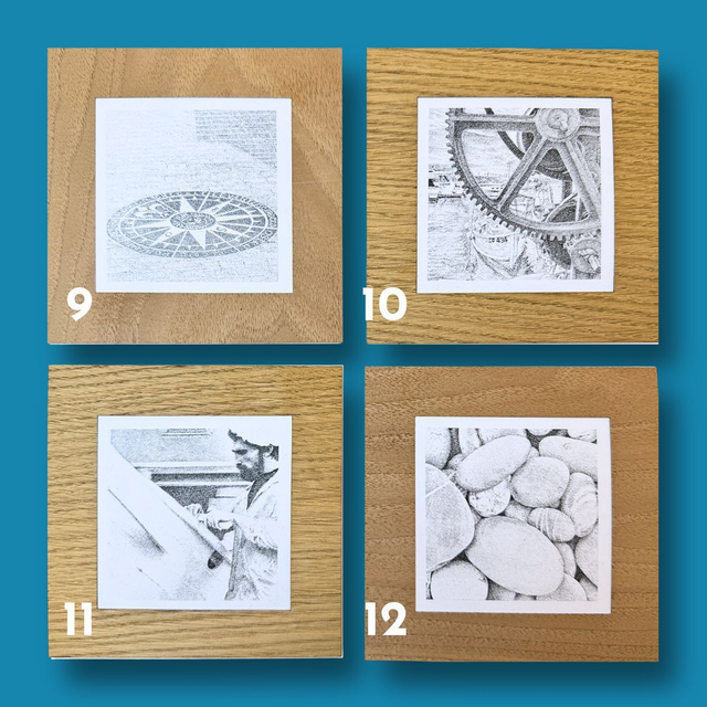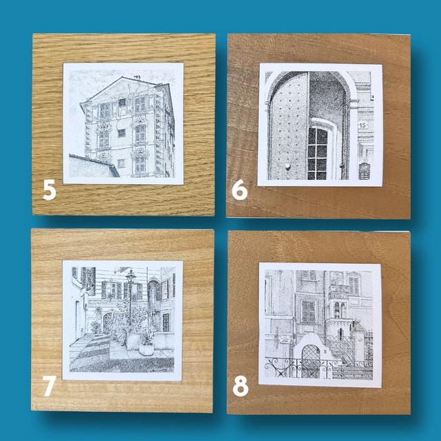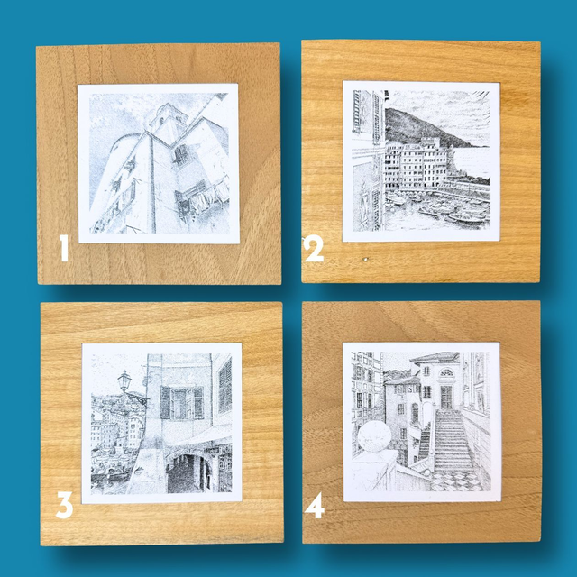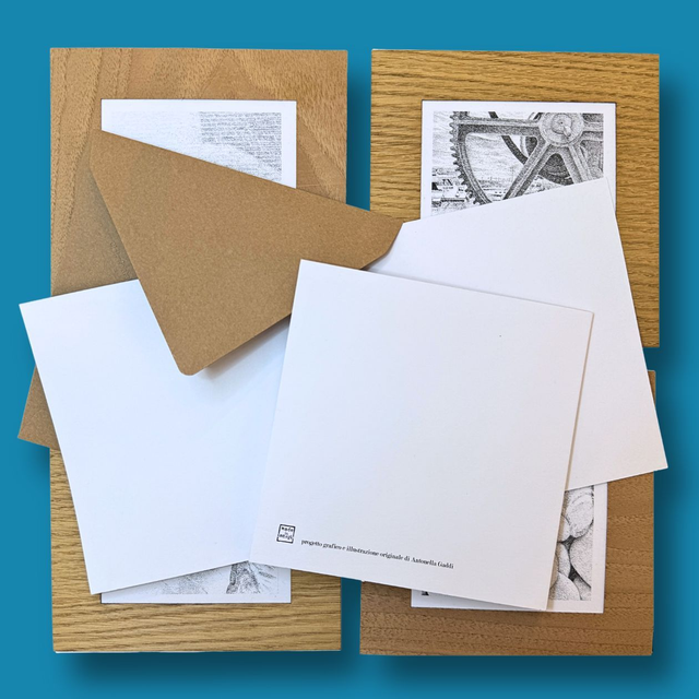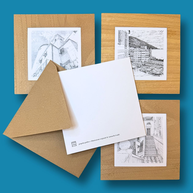 Biglietti cm.13 x 13 (cm.26 x 13 aperti), stampa fine art disegno originale Made in Camogli, 12 soggetti, cornice in legno, con busta.