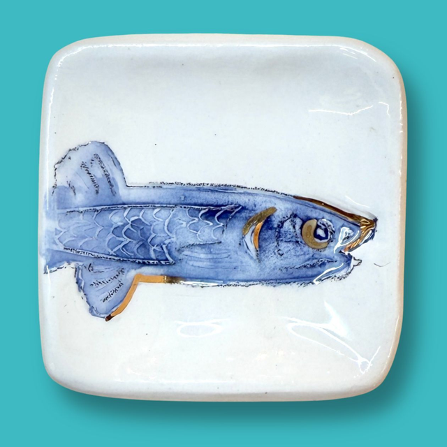 Piattino svuotatasche in ceramica decorata a mano, dettagli in oro zecchino, cm.6x6 h.cm.1. Ogni ciotolina è un pezzo unico, pertanto la decorazione è diversa per ogni singolo pezzo. Potranno esserci ciotoline con una o più "anciöe", oppure con una colorazione leggermente più turchese o tendente alle sfumature del blu.