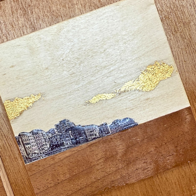 Quadro con base in legno okumè, cm.40x15 spessore cm.1,8, composto da 3 pannelli in legno cm.10x10, spessore 1 cm., decorati con stampa skyline Camogli, impiallicciatura legno di noce, acrilici, foglia oro e resina.