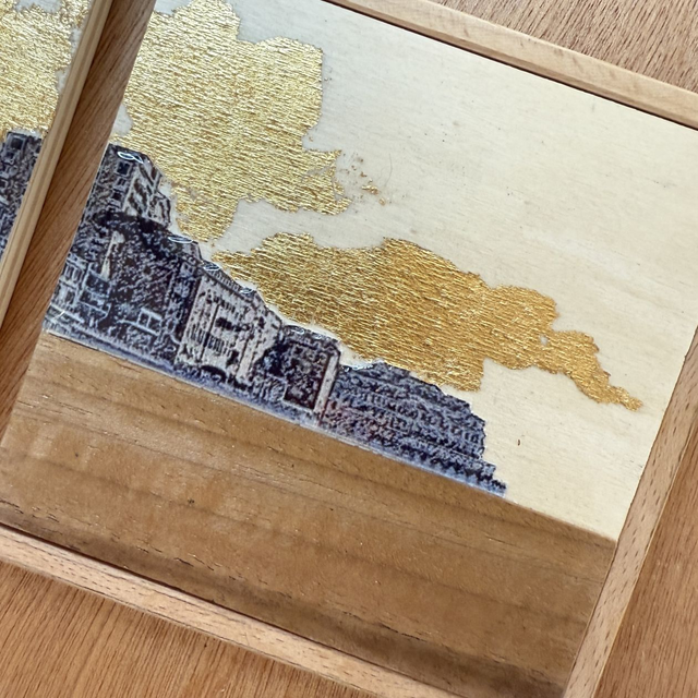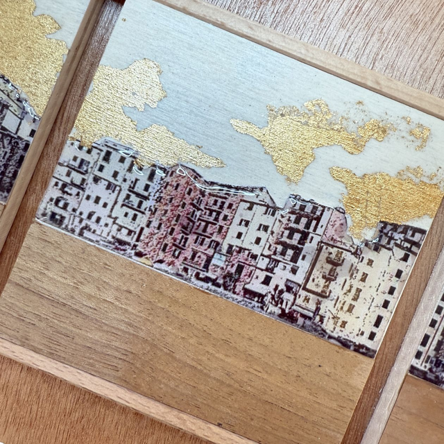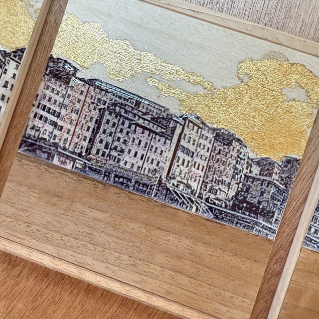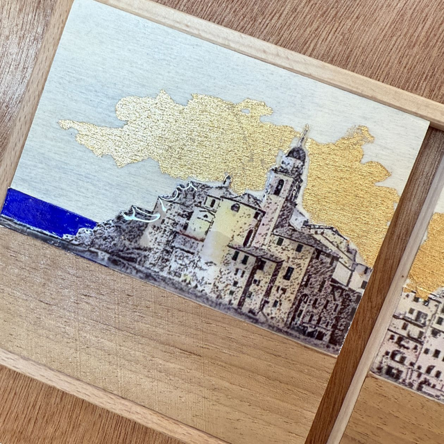 Quadro con base in legno okumè, cm.66x17,5 spessore cm.1, composto da 5 pannelli in legno cm.10x10, spessore 1 cm., decorati con stampa skyline Camogli, impiallicciatura legno di noce, acrilici, foglia oro e resina.