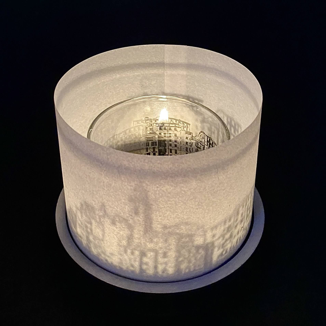 U lummin, il lumino in dialetto ligure, è un "candle light show" : la candela (formato Tea light) al centro del contenitore di vetro, proietta lo skyline di Camogli sulla superficie del diffusore esterno, creando un piacevole gioco di ombre.