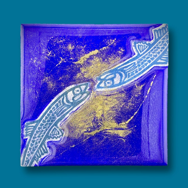 Quadro in legno, cm.12x12 spessore 1 cm. decorata con linoleografie su carta di riso, pigmento oro, acrilici e resina.