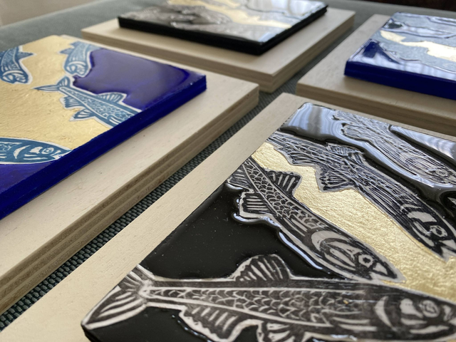 Quadro in legno, cm.20x20 spessore cornice 1 cm., soggetto centrale in legno, cm.20x20 spessore 1 cm., decorato con foglia oro, linoleografie, acrilici e resina. Variante fondo nero.