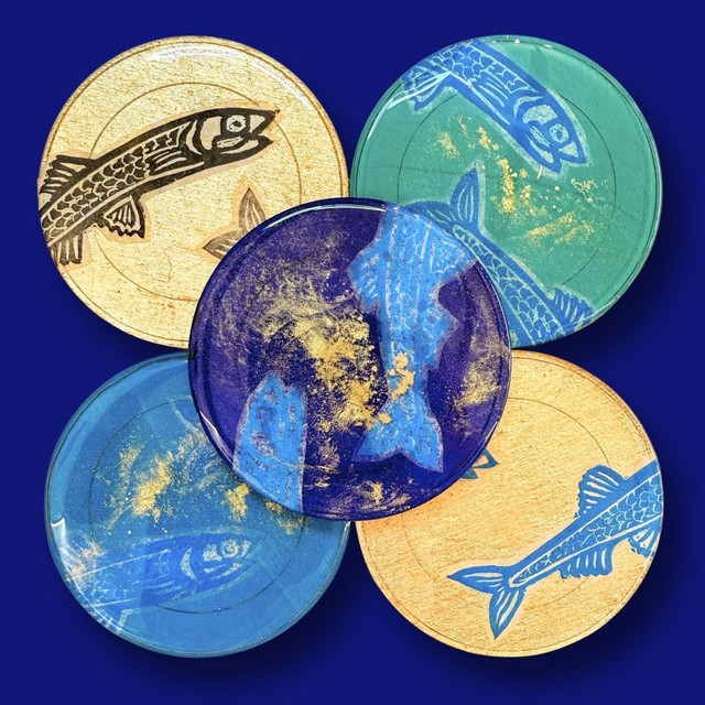Sottobicchieri diametro cm.8,5 in legno, decorati con linoleografie, acrilici, pigmento oro e resina.