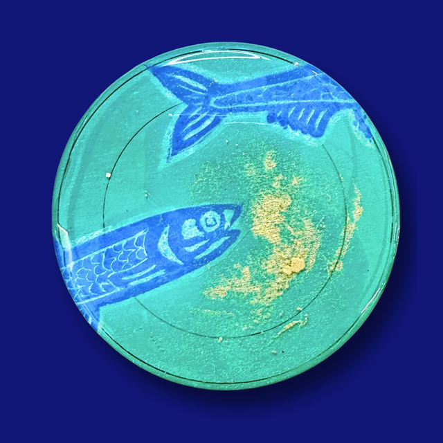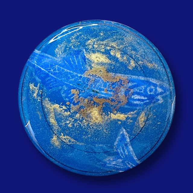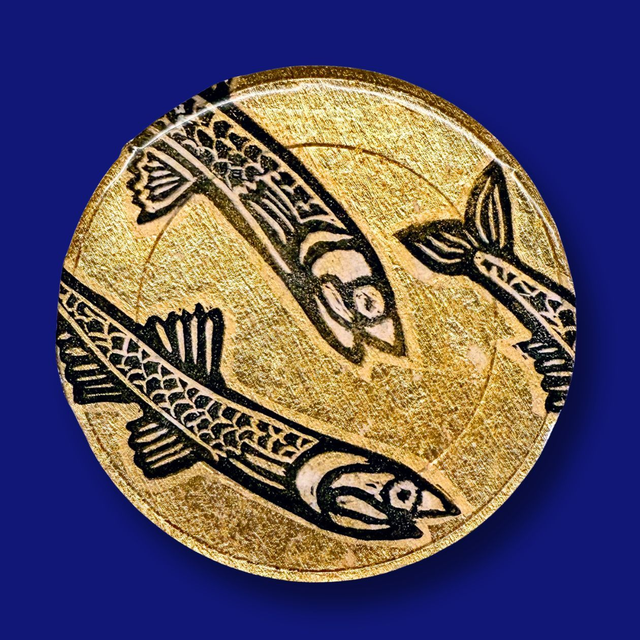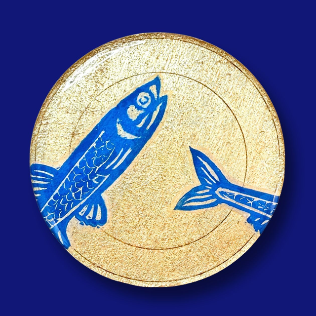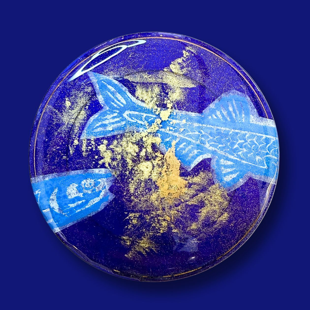 Sottobicchieri diametro cm.8,5 in legno, decorati con linoleografie, acrilici, pigmento oro e resina.